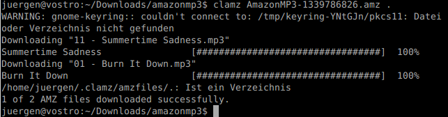 Amazon bietet auf seinem Store DRM-freie MP3 Dateien an, die man mit dem Amazon MP3-Downloader herunterladen kann. Ich habe probiert die Anwendung auf 64Bit Lubuntu zu installieren und, da ich nach ca. 1/2 Stunde Arbeit, keinen Erfolg hatte, habe ich mich für clamz entschieden. Clamz ist ein Kommandozeilen-Tool, das in der Lage ist, die beim Download üblichen amz Dateien, in mp3 Dateien zu entpacken – quasi eine Alternative zum offiziellen MP3-Downloader. Das Tool ist wirklich einfach zu bedienen, im Grunde genügt ein Befehl, um die amz-Datei in eine, oder mehrere mp3-Dateien zu konvertieren.